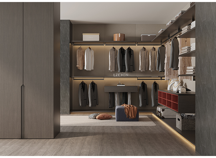 巧妙的运用高端型材与定制化玻璃相结合,内嵌灯带,制成型材玻璃柜,在保留衣柜收纳的基础上,带来通透美感。